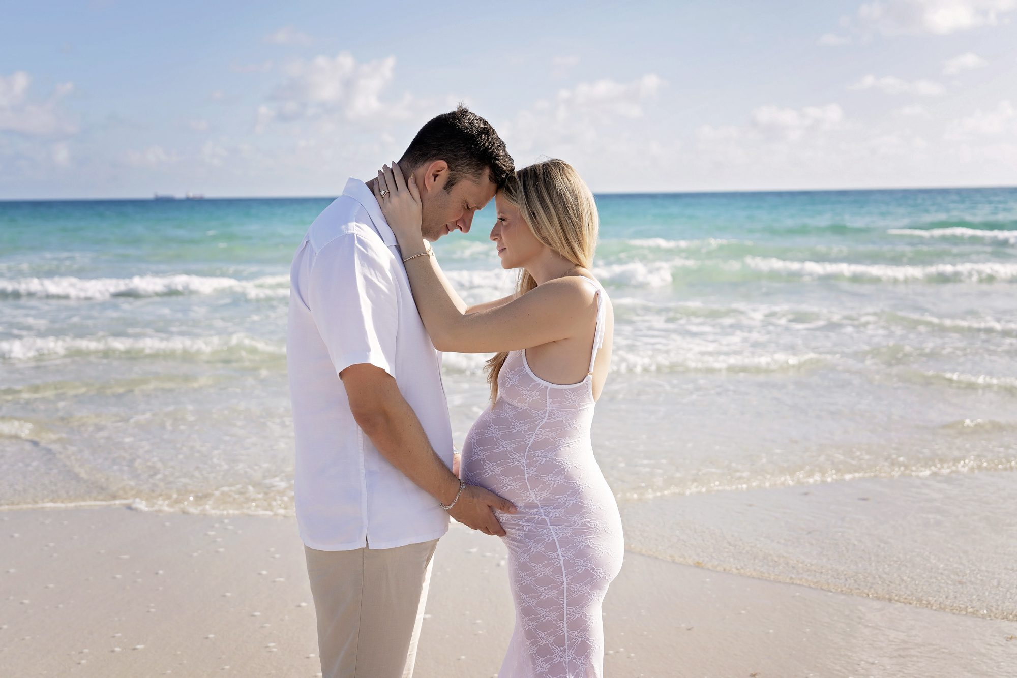 A couple stands close together on Miami Beach, the woman visibly pregnant and touching her belly as they look at each other during their maternity family photoshoot.