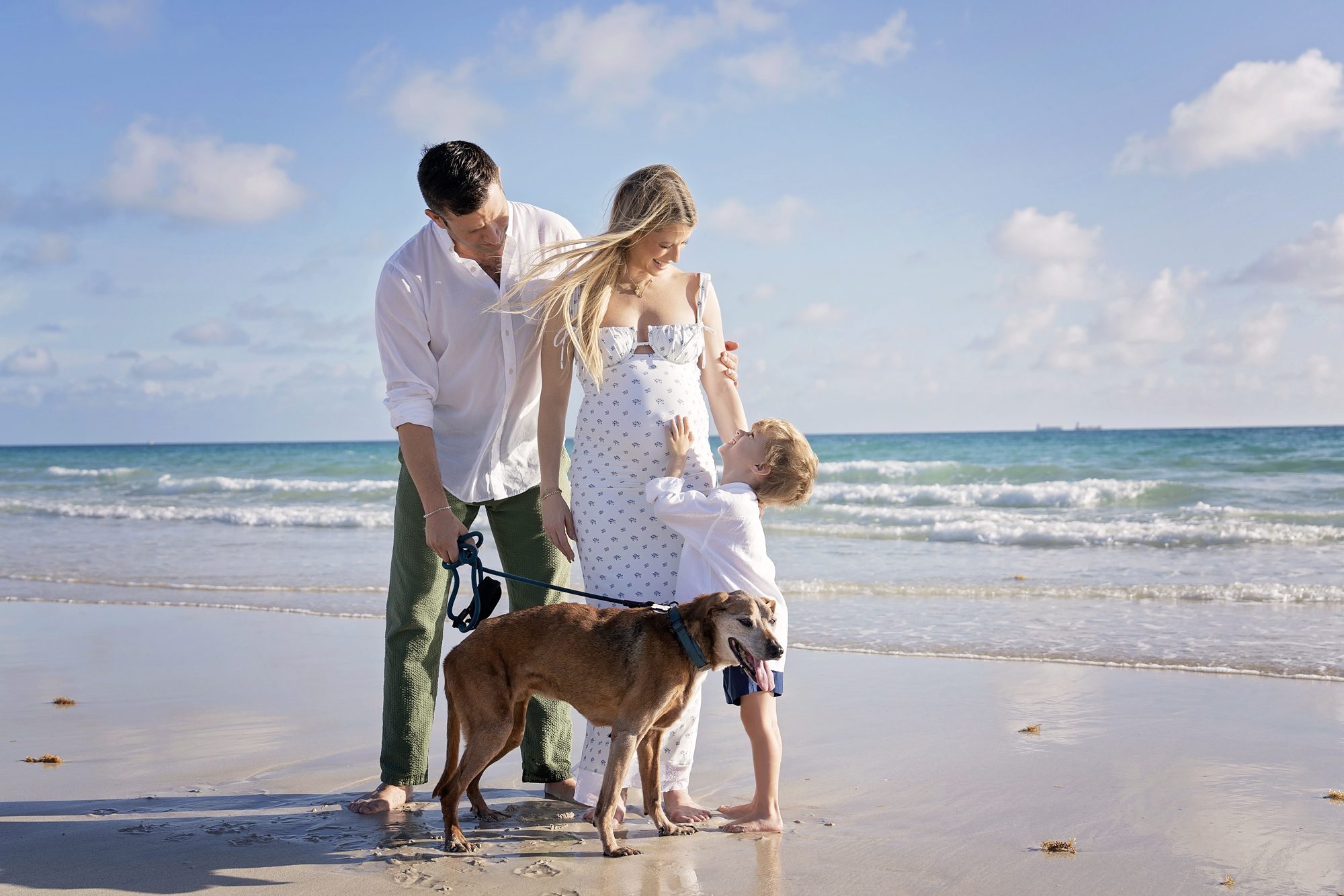 A man, woman, and child with a dog stand together on a sandy shoreline under a partly cloudy sky during a Miami Beach maternity family photoshoot.