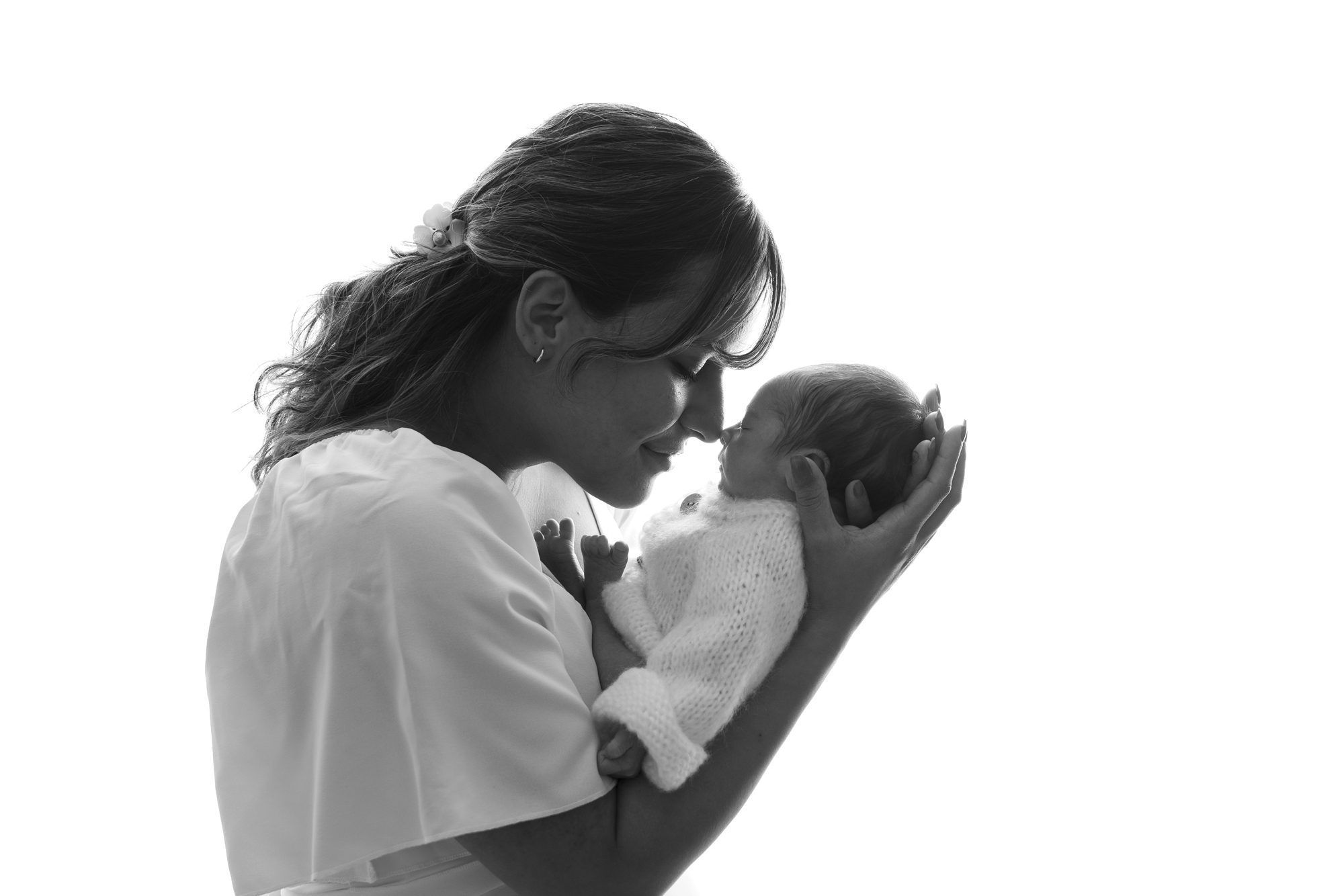 A woman gently holds a newborn baby close, touching their noses together. Both are dressed in light clothing against a white background.