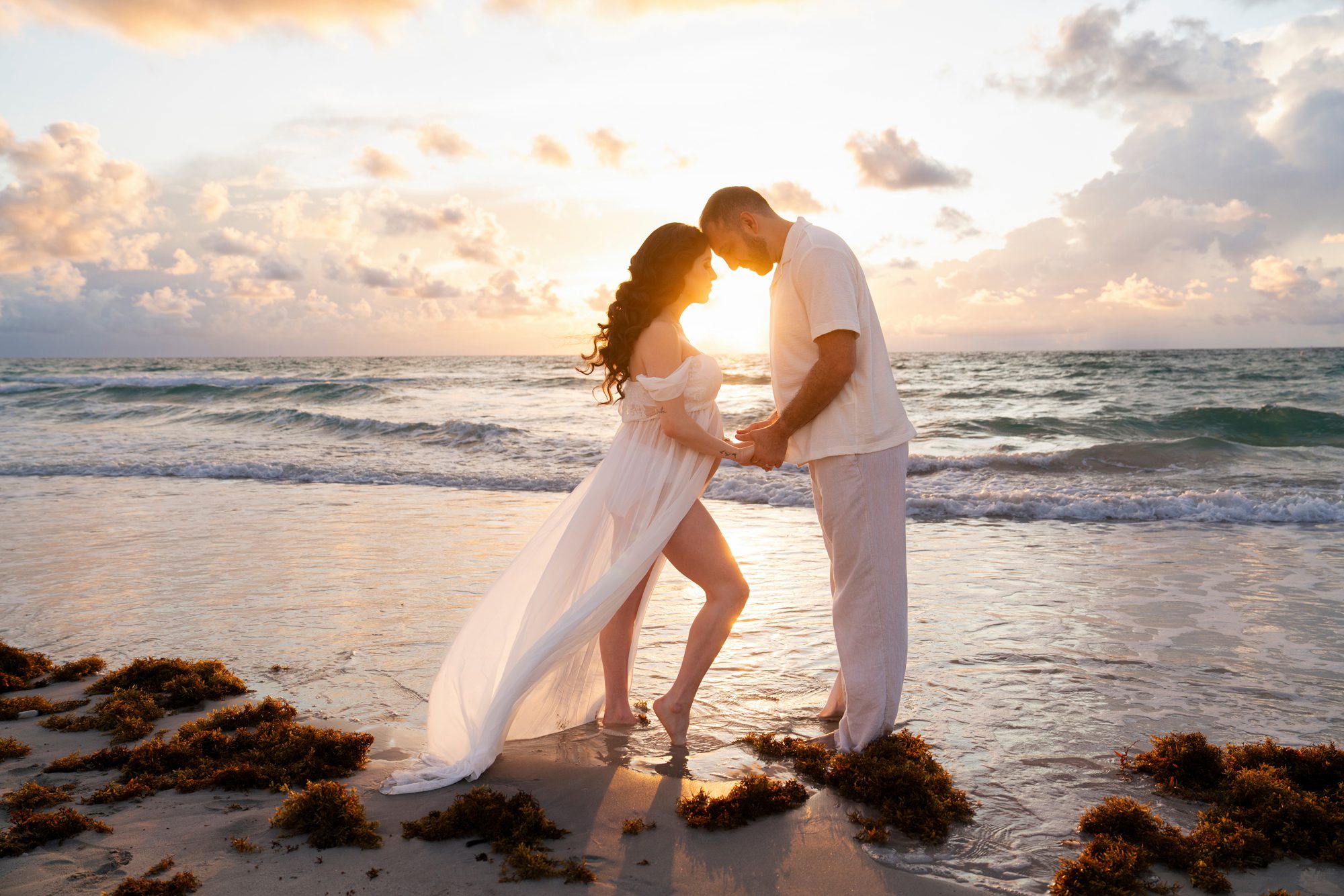 A couple stands barefoot on a beach at sunset, holding hands and touching foreheads, with waves and seaweed in the background.